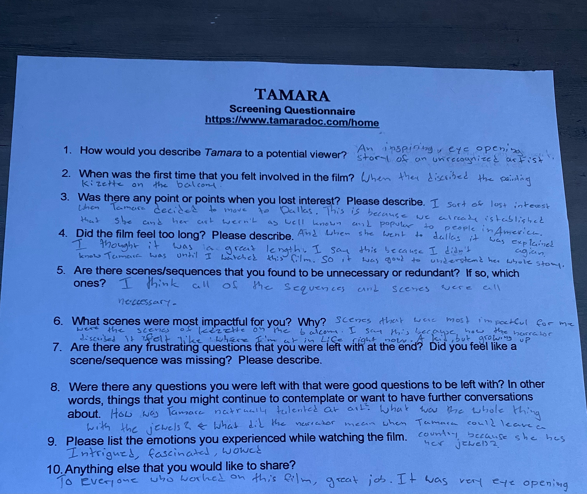 Back in 2023, Neva Tassan, my aunt, was in town and had my family and I watch a rough cut of her film documentary, The True Story of Tamara de Lempicka & the Art of Survival. She gave each of us a questionnaire to fill for feedback. During the summer of 2023, Neva and her team did some massive revisions on the film. She gave me a link to the updated version. As I watched, I filled out the feedback sheet (shown below). By filling out the sheet, I got a credit!